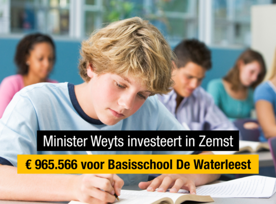 Vlaams minister van Onderwijs Ben Weyts investeert 965.566,38 euro in Gemeentelijke Basisschool De Waterleest in Zemst. “Deze regeerperiode kunnen we met de investeringsimpuls van 3 miljard euro de grootste noden ledigen”, zegt Weyts. Naast nieuwbouw staan er ook heel wat kleinere ingrepen, zoals dringende werken omwille van overmacht gepland, opdat elk kind veilig en comfortabel naar school kan gaan.